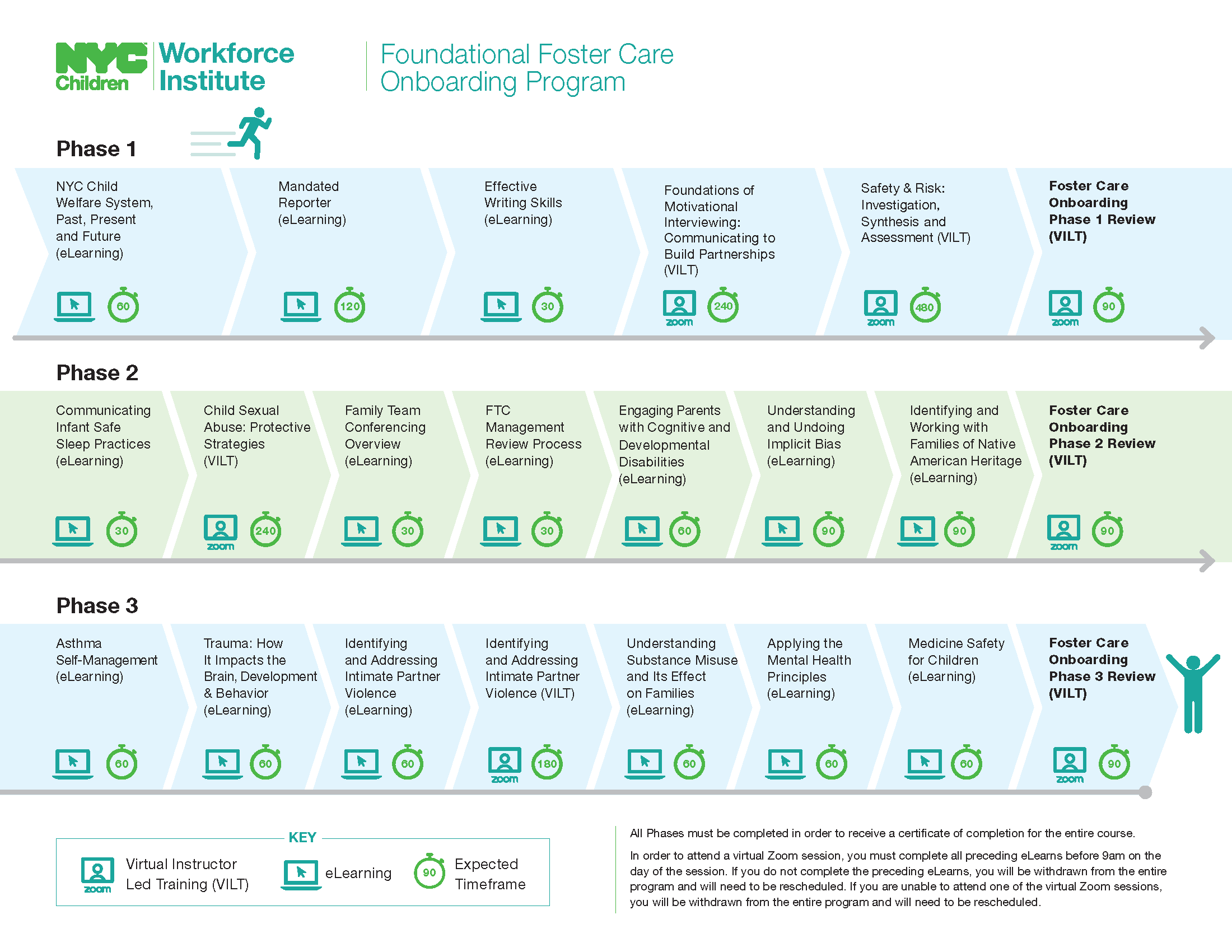 This learning program provides newly hired case planners, supervisors and managers with the foundational knowledge and skills necessary to begin their work in Foster Care services. This learning program is delivered in three phases. Phase 1 focuses on building a foundation for the work. Phase 2 focuses on partnering with families to achieve permanency and well-being. Phase 3 focuses on promoting child, youth and family well-being. This virtual course consists of a combination of eLearning courses and virtual, instructor-led trainings.